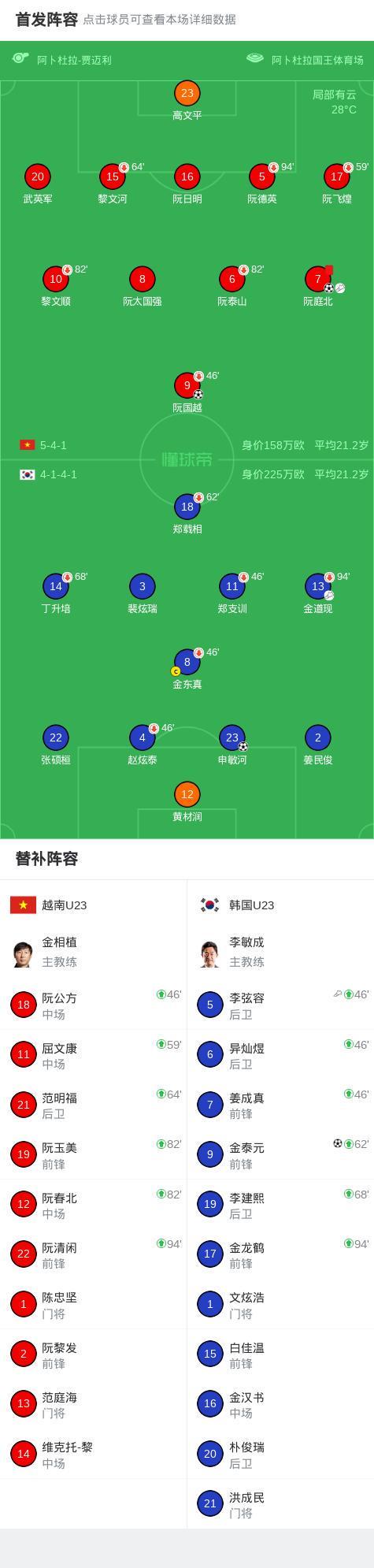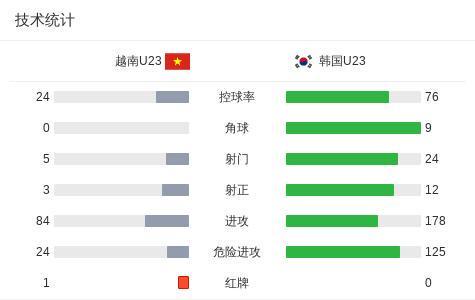 北京时间1月23日U23亚洲杯 季军赛,越南U23对阵韩国U23。上半场,阮庭北助攻,阮国越破门。下半场,金泰元扳平比分。阮庭北任意球破门,不过随后他因踹倒对方被直红罚下。读秒阶段,申敏河完成绝平。90分钟战罢,两队2-2进入加时赛。加时赛,两队均无建树。点球大战,高文平扑点,阮清闲罚入制胜点球。全场比赛结束,U23越南总分9-8战胜韩国,赢得本届杯赛季军。